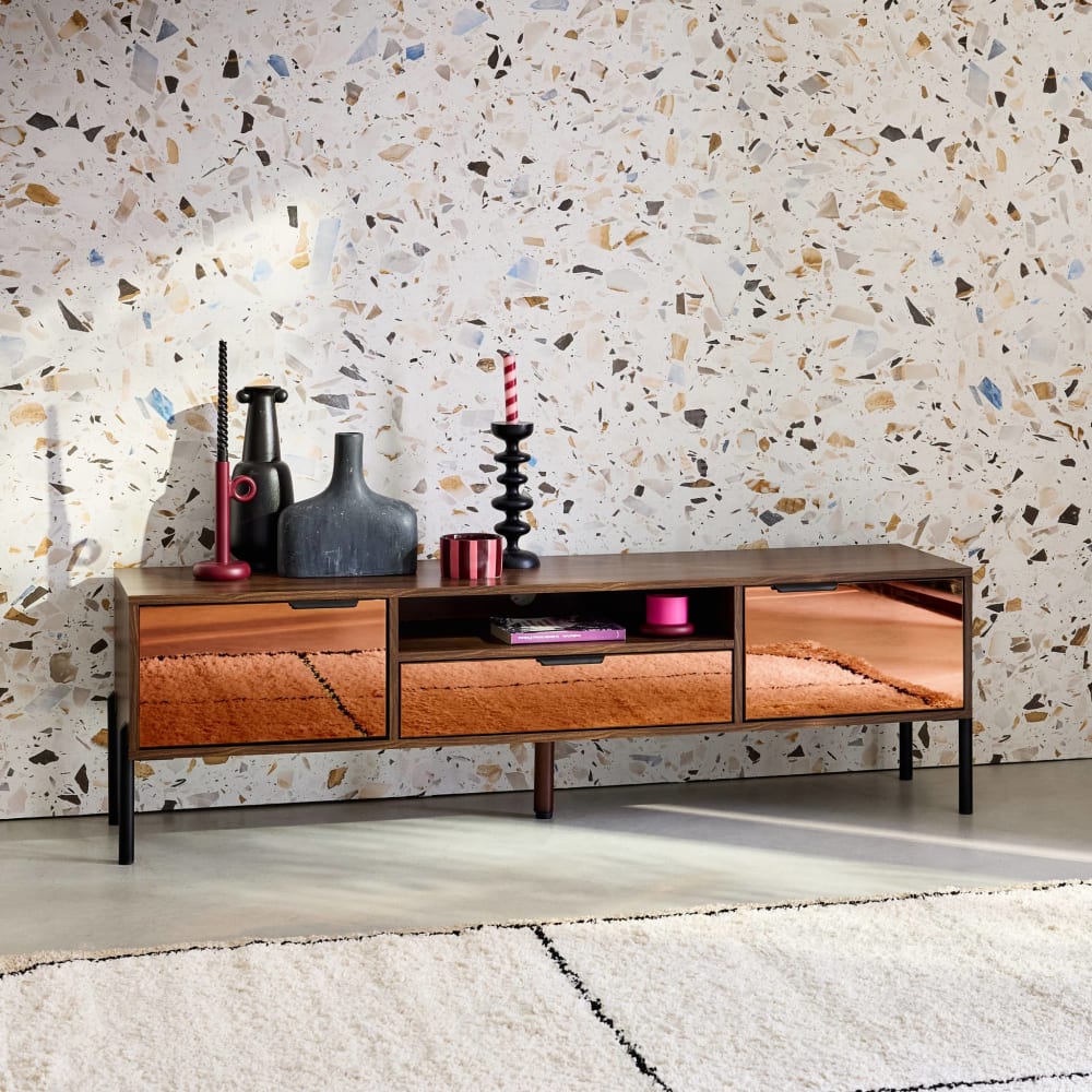 Lassen Sie sich von dem zeitlosen Stil und der Zweckmäßigkeit des TV-Möbels Glassy begeistern und machen Sie Ihr Wohnzimmer zu einem einladenden und zugleich raffinierten Ort.