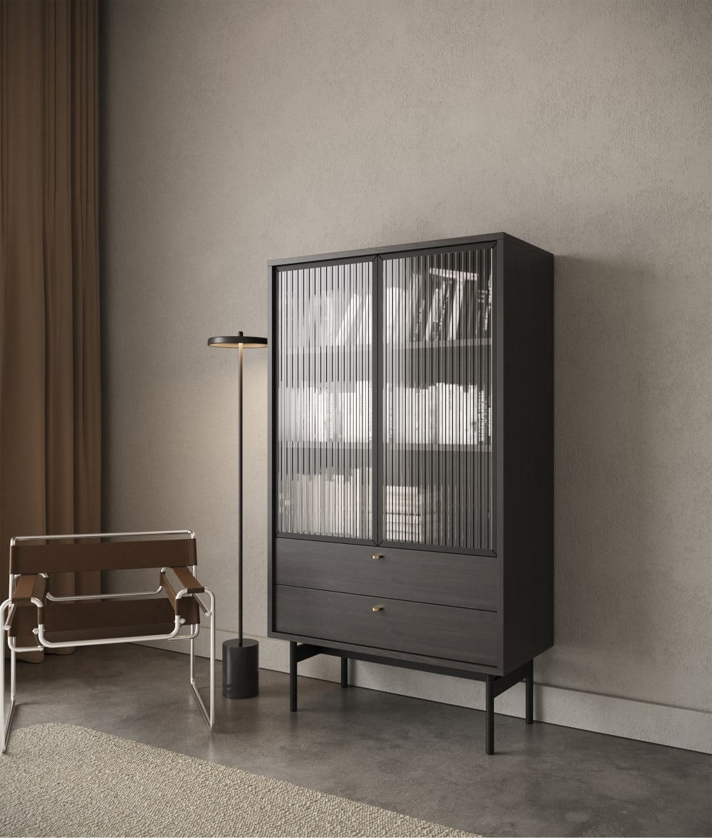 Funktionale Vielseitigkeit: Die Vitrine Olar wurde mit Blick auf Funktionalität konzipiert und bietet Ihnen eine elegante Aufbewahrungslösung für Ihre Schätze. Zwei geräumige Schubladen eignen sich perfekt für die Aufbewahrung kleinerer Gegenstände, die Sie griffbereit haben möchten. Hinter den eleganten, geriffelten Glastüren finden Dekorationen, Familienandenken oder eine kleine Bibliothek ihren Platz.