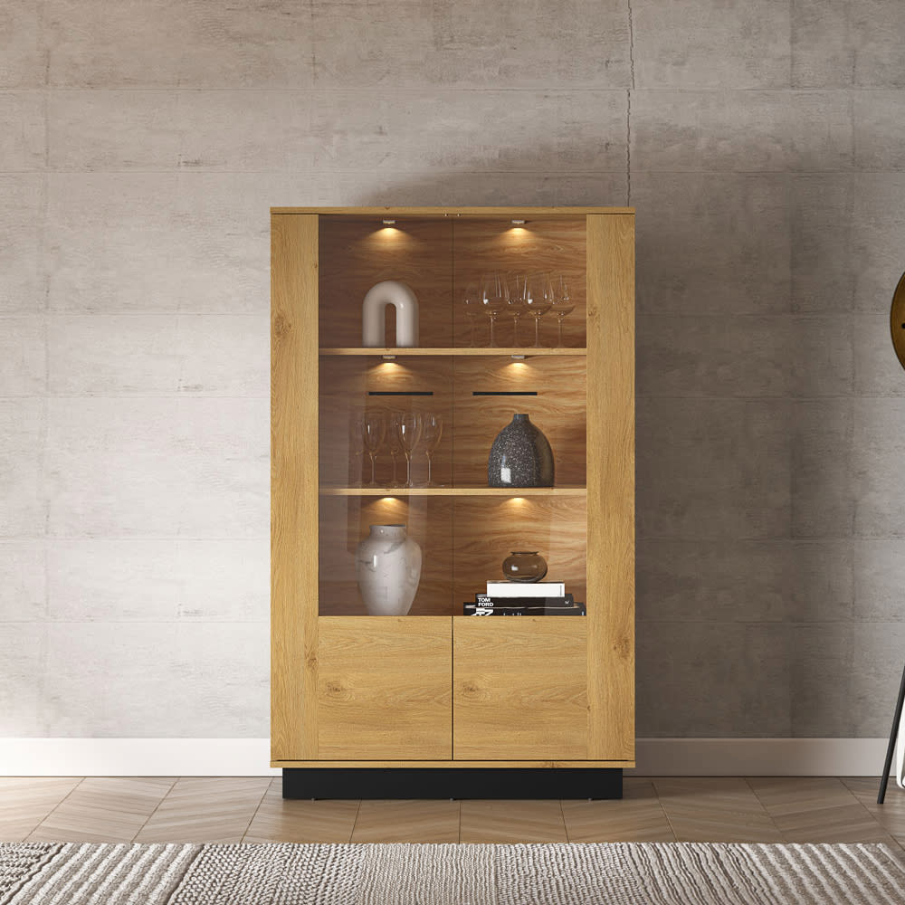 Diese attraktiven Vitrinen werden durch ihre Eleganz ein Hingucker. Wählen Sie sich Ihre Vitrine aus und kombinieren Sie individuell.Farbe: Eiche Style hell / schwarz