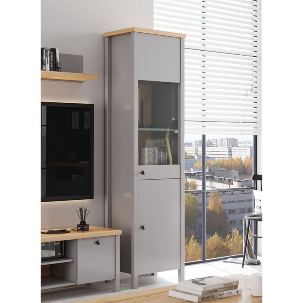 Eine zeitlos schöne und praktische Vitrine im modernen Style aus Eiche Delano hell und schiefergrau.Die Vitrine lässt sich hervorragend integrieren und bietet Ihnen viel Stauraum.