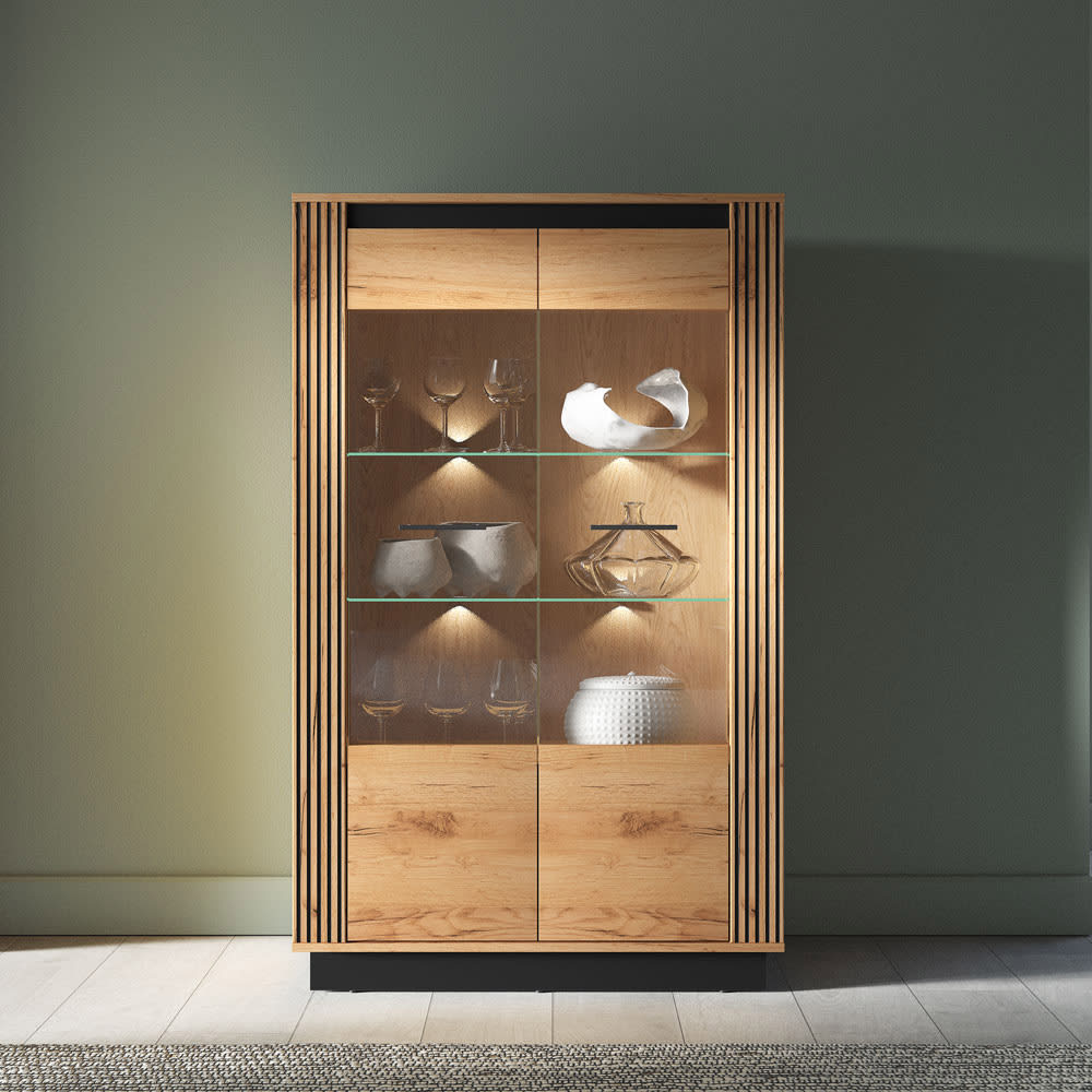 Attraktive Vitrinen, die durch ihre Eleganz ein Hingucker sind. Wählen Sie sich eine Vitrine aus und kombinieren Sie individuell.Farbe: Gold Craft Eiche / schwarz