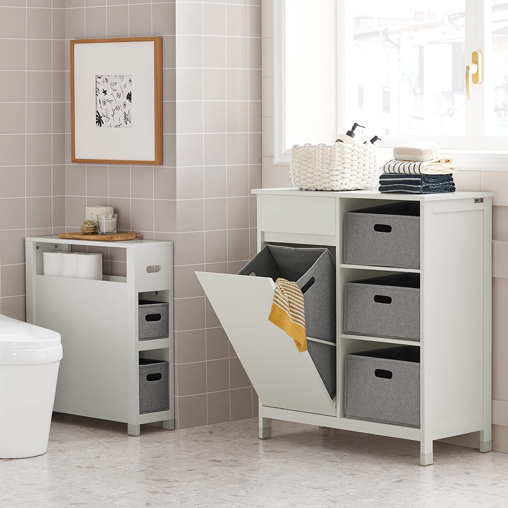 Der Wäscheschrank bietet Ihnen drei Körben und eine kleine Schublade für allerlei Zubehör oder auch Pflegeartikel diverser Art.