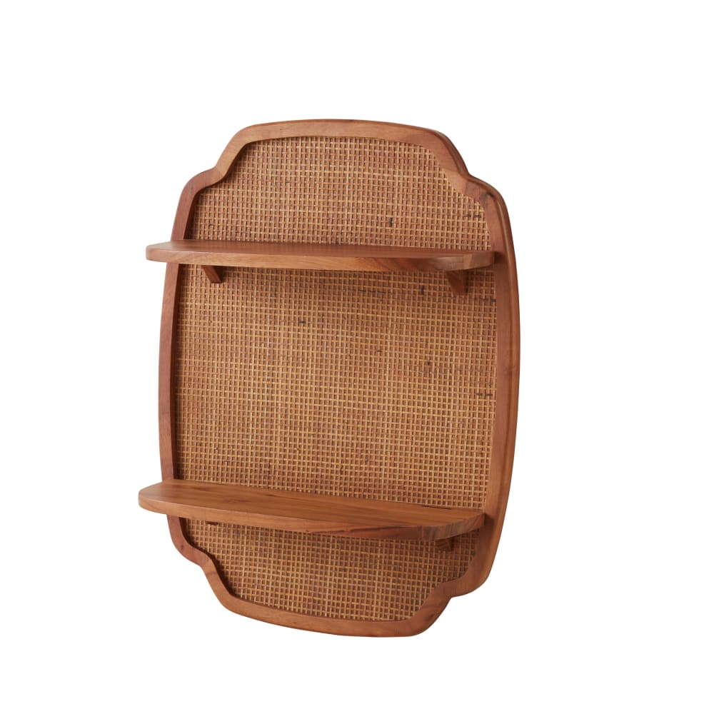 Das Wandregal aus Akazienholz und Rattan INDIRA ist ein originelles und elegantes Möbelstück, das Ihrem Interieur einen Hauch von Bohème-Stil verleiht.Dieses aus dunklem Holz gefertigte Regal ist robust und elegant zugleich.Es bietet Ihnen die Möglichkeit, Ihre Bücher, Pflanzen oder Dekorationsgegenstände aufzubewahren und Ihrem Zimmer gleichzeitig einen Hauch von Charme zu verleihen.