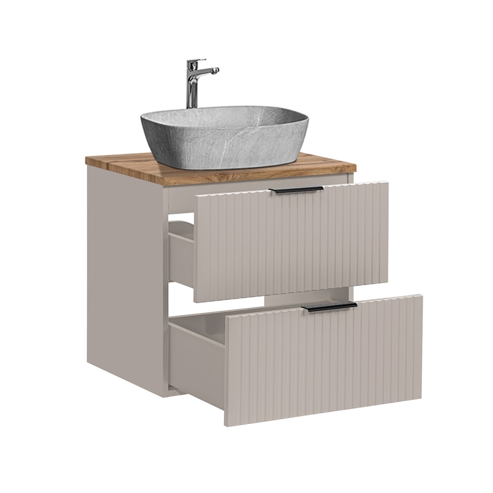 Einzelner Waschtisch mit Steineffekt 60cm Adriel Kaschmir und HolzKollektion :: Adriel Europäische Herstellung Materialien : Melamin- und MDF-Platten 16 mm70% FSC-zertifiziertes Holz aus nachhaltiger ForstwirtschaftKeramikwaschbeckenPVC-Griffe Farbe : Möbel aus KaschmirWaschtisch aus Holz in EichenoptikWaschbecken in Steinoptik3 Grifffarben: Mattschwarz, Gold und Silber inklusive Eigenschaften: Hängeschrank2 SchubladenGeräuscharmes Schließsystem1 Aufsatzwaschbecken inklusiveInklusive WaschtischWandbefestigungen: Schrauben und Dübel nicht inklusiveEs wird empfohlen, die Befestigungen an den Untergrund anzupassenErhältlich in 3 Größen: 60 cm, 80 cm und 120 cmErhältlich in 3 Farben: Mattschwarz, Weiß und Holz in Eichenoptik Weitere Informationen : Armaturen Nicht inbegriffenFreier Auslauf Nicht inbegriffenPlatzsparender Siphon Nicht inbegriffenWaschtischplatte nicht gebohrt Gewicht : Waschtischunterschrank: 27 kgWaschbecken: 9 kg Abmessungen : Waschtischunterschrank: 60,6 x 46 x 59 cmWaschbecken: 50,5 x 38,5 x 13,5 cm Die angegebenen Maße können um einige Millimeter abweichen. Montagehinweise : Dieses Möbelstück ist für eine Wasserzufuhr aus der Wand konzipiert. Für eine optimale Montage wird die Verwendung eines Platzspar-Siphons dringend empfohlen, je nach Modell ist dieser sogar obligatorisch, um das ordnungsgemäße Schließen der Schubladen zu gewährleisten und Kollisionen mit der Rohrleitung zu vermeiden. Verpackung : Produkt wird zur Montage geliefert, inklusive Anleitung. Produkt mit 24-monatiger Garantie. Gesamtanzahl der Kartons : 3 Gewicht und Abmessungen der Kartons: 22 kg82 x 48 x 13 cm / 5 kg73 x 51 x 4 cm / 9 kg57 x 45 x 21 cm
