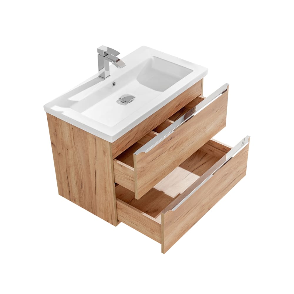 Einzelner Unterbauwaschtisch 80cm April HolzKollektion :: April Materialien : Laminat- und MDF-Platten70% FSC-zertifiziertes Holz aus nachhaltiger ForstwirtschaftGriffe aus verchromtem MetallKeramikwaschbecken Farbe : Möbel in EichenoptikGriffe hochglanzverchromt Eigenschaften: Hängeschrank2 SchubladenGeräuscharmes Schließsystem1 Einbauwaschbecken InklusiveWandbefestigungen: Schrauben und Dübel nicht inklusiveEs wird empfohlen, die Befestigungen an den Untergrund anzupassenDieses Möbelstück ist in 3 Größen erhältlich: 60 cm, 80 cm und 120 cmDieses Möbelstück ist in 2 Farben erhältlich: Holz in Eichenoptik und Weiß lackiert. Weitere Informationen : Spiegel Nicht im Lieferumfang enthaltenArmaturen Nicht im Lieferumfang enthaltenFreier Auslauf Nicht im Lieferumfang enthaltenPlatzsparender Siphon Nicht im Lieferumfang enthalten Gewicht : Waschtischunterschrank: 40 kgWaschbecken: 16 kg Abmessungen : Waschtischunterschrank: 80,4 x 46 x 57 cmWaschbecken: 81 x 46 x 14 cm Die angegebenen Maße können um einige Millimeter abweichen. Verpackung: Produkt wird zur Montage geliefert, inklusive Anleitung. Produkt mit 24-monatiger Garantie. Gesamtanzahl der Kartons : 2 Gewicht und Abmessungen der Kartons: 33 kg93 x 48 x 20 cm / 18 kg84 x 48 x 18 cm