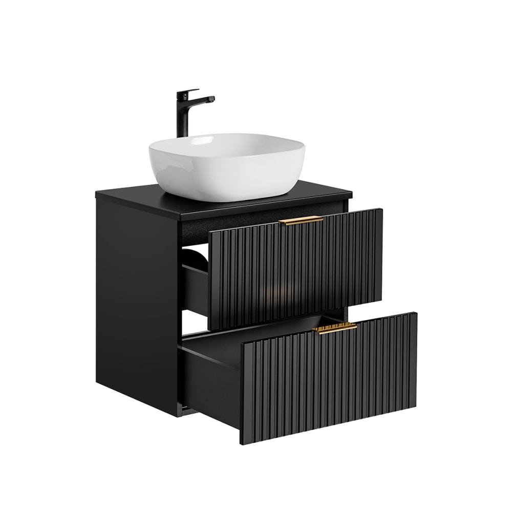 Waschbeckenunterschrank 60cm Adriel SchwarzKollektion :: Adriel Materialien : Melamin- und MDF-Platten 16 mm70% FSC-zertifiziertes Holz aus nachhaltiger ForstwirtschaftKeramikwaschbeckenPVC-Griffe Farbe : Mattschwarz3 Grifffarben: Mattschwarz, Gold und Silber inbegriffen Eigenschaften: Hängeschrank2 SchubladenGeräuscharmes SchließsystemInklusive AufsatzwaschbeckenInklusive WaschtischWandbefestigungen: Schrauben und Dübel nicht inklusiveEs wird empfohlen, die Befestigungen an den Untergrund anzupassenErhältlich in 3 Größen: 60 cm, 80 cm und 120 cmErhältlich in 3 Farben: Mattschwarz, Weiß und Holz in Eichenoptik Weitere Informationen : Armaturen Nicht inbegriffenFreier Auslauf Nicht inbegriffenPlatzsparender Siphon Nicht inbegriffenWaschtischplatte nicht gebohrt Gewicht : Waschtischunterschrank: 27 kgWaschbecken: 7 kg Abmessungen : Waschtischunterschrank: 60,6 x 46 x 59 cmWaschbecken: 41 x 41 x 15 cm Die angegebenen Maße können um einige Millimeter abweichen. Montagehinweise : Dieses Möbelstück ist für eine Wasserzufuhr aus der Wand konzipiert. Für eine optimale Montage wird die Verwendung eines Platzspar-Siphons dringend empfohlen, je nach Modell ist dieser sogar obligatorisch, um das ordnungsgemäße Schließen der Schubladen zu gewährleisten und Kollisionen mit der Rohrleitung zu vermeiden. Verpackung : Produkt wird geliefert, muss zusammengebaut werden, inkl. Anleitung. Produkt mit 24-monatiger Garantie. Gesamtanzahl der Kartons : 3 Gewicht und Abmessungen der Kartons: 22 kg82 x 48 x 13 cm / 5 kg73 x 51 x 4 cm / 8 kg52 x 52 x 24 cm