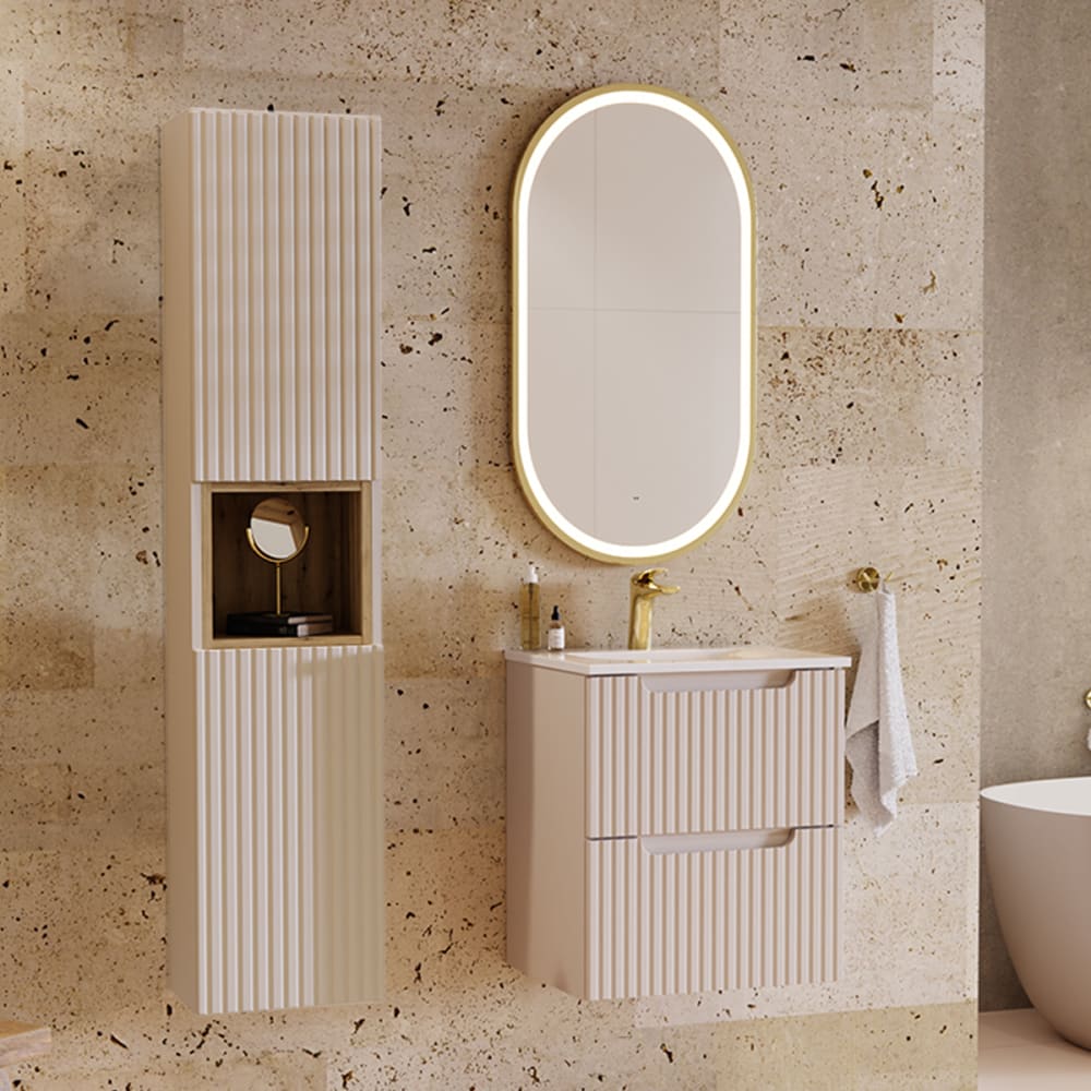 Möbelset Einzelwaschtisch 50cm 2 Schubladen und Säule Riva Kaschmir und HolzKollektion :: Riva Herstellung: Europäisch Materialien : Front aus 16 mm MDF-PlattenKorpus aus 16 mm Melaminplatten70% FSC-zertifiziertes Holz aus nachhaltiger ForstwirtschaftWaschbecken aus Keramik Farbe : KaschmirNische aus Holz in Eichenoptik und weißes Waschbecken Eigenschaften : Waschtisch : Hängeschrank2 SchubladenGeräuscharmes SchließsystemEinbauwaschtisch InklusiveWandbefestigung : Schrauben und Dübel nicht inklusiveEs wird empfohlen, die Befestigung an den Untergrund anzupassenDieses Möbelstück ist in 3 Größen erhältlich : 50 cm, 60 cm und 80 cmDieses Möbelstück ist in 3 Farben erhältlich : Schwarz, Weiß und Kaschmir. Eigenschaften : Colonne : Hängemöbel2 umkehrbare Schiebetüren (links oder rechts zu öffnen)2 Regale1 zentrale NischeGeräuscharmes SchließsystemWandbefestigungen : Schrauben und Dübel nicht inklusiveEs wird empfohlen, die Befestigungen an den Untergrund anzupassenDieses Möbelstück ist in 3 Farben erhältlich: Schwarz, Weiß und Kaschmir. Weitere Informationen : Spiegel Nicht im Lieferumfang enthaltenArmaturen Nicht im Lieferumfang enthaltenFreier Auslauf Nicht im Lieferumfang enthaltenPlatzsparender Siphon Nicht im Lieferumfang enthalten Gewicht : Waschtischunterschrank: 18 kg9 kg53 x 43 x 17 cm kgSäule: 21 kg Abmessungen : Waschtischunterschrank: 50 x 39 x 57 cmWaschbecken: 51 x 40 x 15 cmSäule: 30 x 25 x 140 cm Die angegebenen Maße können um einige Millimeter abweichen. Verpackung : Produkt wird zur Montage geliefert, inklusive Anleitung. Garantie: Produktgarantie von 24 Monaten. Gesamtanzahl der Kartons : 4 Gewicht und Abmessungen der Kartons: 18 kg90,2 x 40,8 x 12,2 cm / 9 kg53 x 43 x 17 cm / 18 kg168,2 x 33 x 7,7 cm / 4 kg50,3 x 26,9 x 9 cm