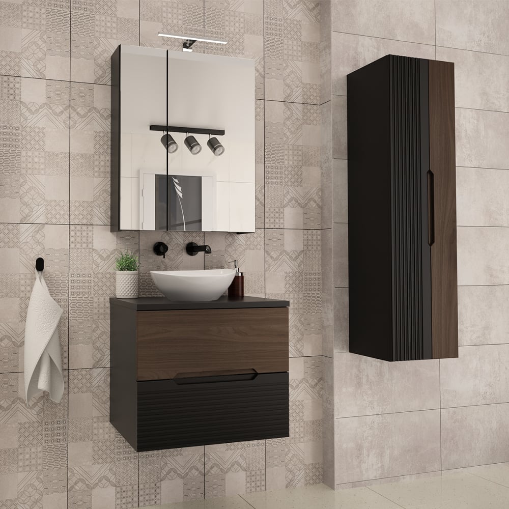 Set aus Einzelwaschtisch 60cm und Säule Sylla Schwarz und HolzKollektion :: Sylla Europäische Herstellung Materialien : Front aus 18 mm MDF-PlattenKorpus aus 16 mm LaminatplattenFSC-zertifiziertes Holz aus nachhaltiger ForstwirtschaftKeramikwaschbecken Farbe : Schwarz und Holz Eigenschaften: Waschtisch: Hängeschrank2 SchubladenGeräuscharmes SchließsystemWaschtisch: inklusiveWaschbecken: inklusiveWandbefestigungen: Schrauben und Dübel inklusiveEs wird jedoch empfohlen, Ihre Befestigungen an Ihren Untergrund anzupassen. Eigenschaften : Säule : Hängemöbel2 Türen : umkehrbarer Schieber (links oder rechts öffnend)4 Regalbödengeräuscharmes SchließsystemWandbefestigungen : Schrauben und Dübel inbegriffenEs wird jedoch empfohlen, Ihre Befestigungen an Ihren Untergrund anzupassen. Weitere Informationen : Spiegel: nicht inbegriffenArmaturen: nicht inbegriffenFreier Abfluss: nicht inbegriffenSiphon: nicht inbegriffenWaschtischplatte: nicht gebohrt Gewicht : Waschtischunterschrank: 21 kgWaschbecken: 6 kgSäule: 23 kg Abmessungen : Waschtischunterschrank: 60,6 x 46,5 x 52,2 cmWaschbecken: 40,5 x 13,5 x 33,7 cmSäule: 34,5 x 31,8 x 130 cm Die angegebenen Maße können um einige Millimeter abweichen Sicherheitshinweise: Befestigen Sie das Möbelstück sicher an der WandBeachten Sie die empfohlenen Höchstlasten, die in den Anleitungen angegeben sind. Verpackung : Produkt wird zur Montage geliefert, inkl. Anleitung Produkt mit 24-Monats-Garantie Gesamtanzahl der Kartons : 4 Gewicht und Abmessungen der Kartons: 17 kg67 x 48 x 14 cm / 4 kg61 x 51 x 3 cm / 6,5 kg51 x 40 x 22 cm / 23 kg137 x 39 x 9 cm Gesetzlicher Vertreter: NAPKINS, 30-34 avenue Henri Matisse, 06200 Nizza, FRANKREICH