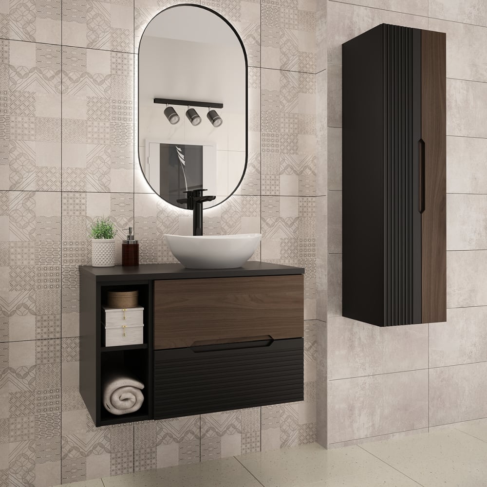 Set aus Einzelwaschtisch 80cm Nische und Säule Sylla Schwarz und HolzKollektion :: Sylla Europäische Herstellung Materialien : Front aus 18 mm MDF-PlattenKorpus aus 16 mm LaminatplattenFSC-zertifiziertes Holz aus nachhaltiger ForstwirtschaftKeramikwaschbecken Farbe : Schwarz und Holz Eigenschaften: Waschtisch: Hängeschrank2 Schubladen2 NischenGeräuscharmes SchließsystemWaschtisch: inklusiveWaschbecken: inklusiveWandbefestigungen: Schrauben und Dübel inklusiveEs wird jedoch empfohlen, Ihre Befestigungen an den Untergrund anzupassen. Eigenschaften : Säule : Hängemöbel2 Türen : umkehrbarer Schieber (links oder rechts öffnend)4 Regalbödengeräuscharmes SchließsystemWandbefestigungen : Schrauben und Dübel inbegriffenEs wird jedoch empfohlen, Ihre Befestigungen an Ihren Untergrund anzupassen. Weitere Informationen : Spiegel: nicht inbegriffenArmaturen: nicht inbegriffenFreier Abfluss: nicht inbegriffenSiphon: nicht inbegriffenWaschtischplatte: nicht gebohrt Gewicht : Waschtischunterschrank: 31 kgWaschbecken: 6 kgSäule: 23 kg Abmessungen : Waschtischunterschrank: 80,6 x 45,8 x 52,2 cmWaschbecken: 40,5 x 13,5 x 33,7 cmSäule: 34,5 x 31,8 x 130 cm Die angegebenen Maße können um einige Millimeter abweichen Sicherheitshinweise: Befestigen Sie das Möbelstück sicher an der WandBeachten Sie die empfohlenen Höchstlasten, die in den Anleitungen angegeben sind. Verpackung : Produkt wird zur Montage geliefert, inkl. Anleitung Produkt mit 24-Monats-Garantie Gesamtanzahl der Kartons : 5 Gewicht und Größe der Kartons: 17 kg67 x 48 x 14 cm / 9 kg61 x 48 x 14 cm / 5 kg81 x 51 x 3 cm / 6,5 kg51 x 40 x 22 cm / 23 kg137 x 39 x 9 cm Gesetzlicher Vertreter: NAPKINS, 30-34 avenue Henri Matisse, 06200 Nizza, FRANKREICH