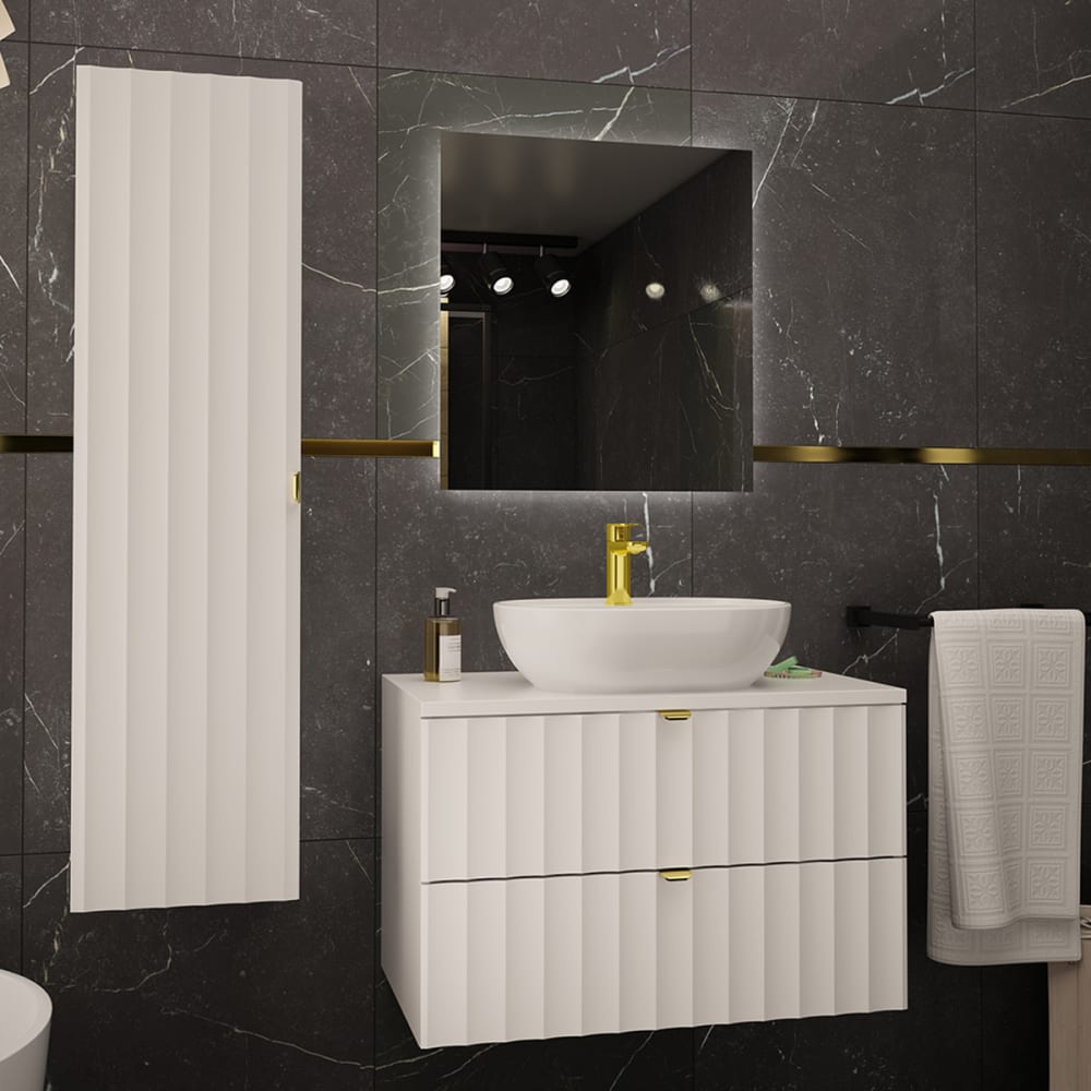 Set aus Einzelwaschtisch 80cm und Säule Lexa WeißKollektion :: Lexa Europäische Herstellung Materialien : Front aus 18 mm MDF-PlattenKorpus aus 16 mm LaminatplattenWaschtisch aus 22 mm MDF-Platten und PVC-FinishFSC-zertifiziertes Holz aus nachhaltiger ForstwirtschaftKeramikwaschbeckenMetallgriffe Farbe : Weiß und goldene Griffe Eigenschaften: Waschtisch: Hängeschrank2 SchubladenGeräuscharmes SchließsystemInklusive AufsatzwaschbeckenAbflussdurchmesser: 45 mmInklusive WaschtischWandbefestigungen: Schrauben und Dübel inklusiveEs wird jedoch empfohlen, Ihre Befestigungen an den Untergrund anzupassen. Eigenschaften : Säule : Hängemöbel1 umkehrbare Schiebetür (links oder rechts zu öffnen)4 Regalböden Geräuscharmes SchließsystemWandbefestigungen : Schrauben und Dübel inklusiveEs wird jedoch empfohlen, Ihre Befestigungen an Ihren Untergrund anzupassen. Weitere Informationen : Spiegel nicht inbegriffenArmaturen nicht inbegriffenFreier Auslauf nicht inbegriffenSiphon nicht inbegriffenWaschtisch nicht gebohrt Gewicht : Waschtischunterschrank: 24 kgWaschbecken: 10 kgSäule: 23 kg Abmessungen : Waschtischunterschrank: 80,6 x 46,5 x 52,2 cmWaschbecken: 50 x 38 x 12 cmSäule: 34,5 x 31,8 x 130 cm Die angegebenen Maße können um einige Millimeter abweichen Sicherheitshinweise: Befestigen Sie das Möbelstück sicher an der WandBeachten Sie die empfohlenen Höchstlasten, die in den Anleitungen angegeben sind. Verpackung : Produkt wird zur Montage geliefert, inkl. Anleitung Produkt mit 24-Monats-Garantie Gesamtanzahl der Kartons : 4 Gewicht und Abmessungen der Kartons : Gewicht und Abmessungen der Kartons: 5 kg81 x 51 x 3 cm / 19 kg86 x 48 x 12 cm / 10 kg66 x 50 x 23 cm/ 23 kg137 x 36 x 9 cm Gesetzlicher Vertreter: NAPKINS, 30-34 avenue Henri Matisse, 06200 Nizza, Frankreich