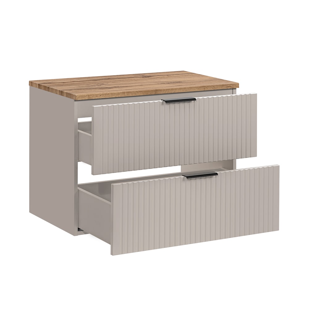 Waschbeckenunterschrank 80cm Waschtisch Adriel Kaschmir und HolzKollektion :: Adriel Europäische Herstellung Materialien : Melamin- und MDF-Platten 16 mm70% FSC-zertifiziertes Holz aus nachhaltiger ForstwirtschaftPVC-Griffe Farbe : Möbel aus KaschmirWaschtisch aus Holz in Eichenoptik3 Grifffarben: Mattschwarz, Gold und Silber inklusive Eigenschaften: Hängeschrank2 SchubladenGeräuscharmes SchließsystemInklusive WaschtischWandbefestigungen: Schrauben und Dübel inbegriffenEs wird empfohlen, die Befestigungen an den Untergrund anzupassenIn 3 Größen erhältlich: 60 cm, 80 cm und 120 cmIn 3 Farben erhältlich: Mattschwarz, Weiß und Holz in Eichenoptik Gewicht : Waschtischunterschrank: 33 kg Maße: 80,6 x 46 x 59 cm Die angegebenen Maße können um einige Millimeter abweichen. Montagehinweise : Dieses Möbelstück ist für eine Wasserzufuhr aus der Wand konzipiert. Für eine optimale Montage wird die Verwendung eines Platzspar-Siphons dringend empfohlen, je nach Modell ist dieser sogar obligatorisch, um das ordnungsgemäße Schließen der Schubladen zu gewährleisten und Kollisionen mit der Rohrleitung zu vermeiden. Verpackung : Produkt wird geliefert, muss zusammengebaut werden, inkl. Anleitung. Produkt mit 24-monatiger Garantie. Gesamtanzahl der Kartons : 2 Gewicht und Abmessungen der Kartons: 26 kg92 x 48 x 13 cm / 7 kg93 x 51 x 4 cm