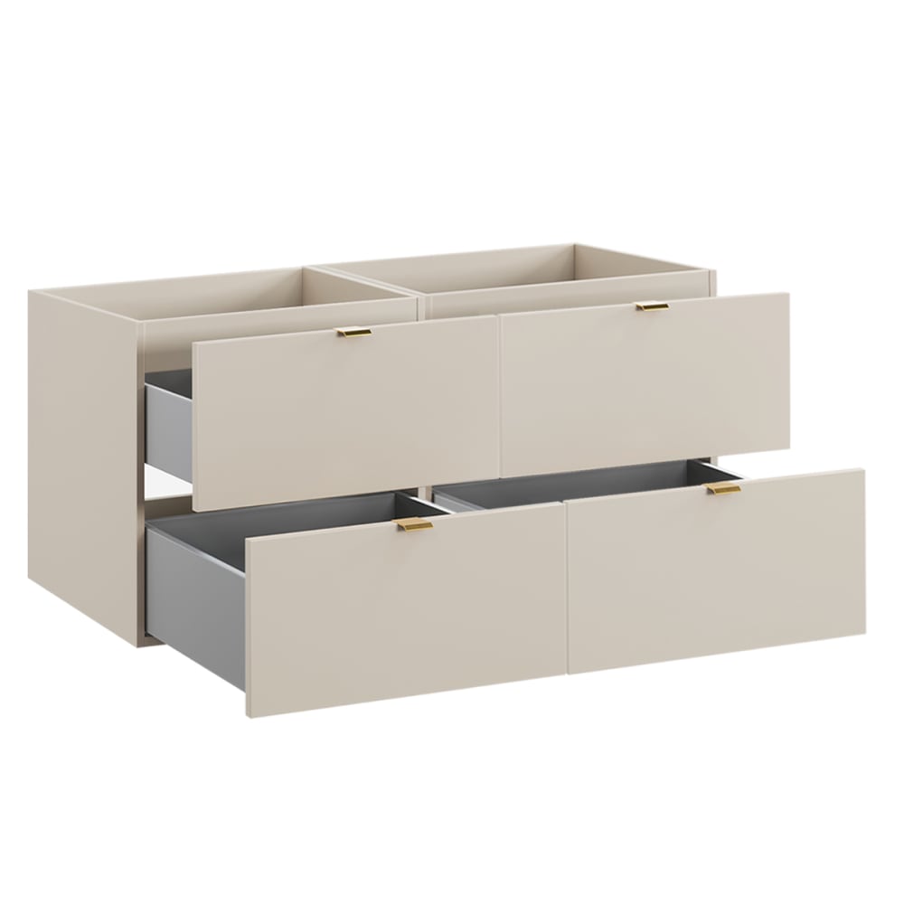 Waschtischunterschrank 120cm Azel KaschmirKollektion :: Azel Europäische Herstellung Materialien : Frontseite aus 16 mm MDF-PlattenKorpus aus 16 mm Melaminplatten70% FSC-zertifiziertes Holz aus nachhaltiger Forstwirtschaft Farbe : Kaschmir3 Grifffarben: Glänzendes Gold, Glänzendes Chrom und Mattschwarz inbegriffen Eigenschaften: Hängeschrank2 SchubladenGeräuscharmes SchließsystemWandbefestigung: Schrauben und Dübel inbegriffenEs wird jedoch empfohlen, Ihre Befestigungen an Ihren Untergrund anzupassenDieses Möbelstück gibt es in 3 Größen: 60 cm, 80 cm und 120 cm. Weitere Informationen : Spiegel nicht inbegriffenArmaturen nicht inbegriffenFreier Auslauf nicht inbegriffenPlatzsparender Siphon nicht inbegriffenWaschtisch nicht inbegriffen Gewicht : 31 kg Maße: 120 x 46 x 50 cm Die angegebenen Maße können um einige Millimeter abweichen Montagehinweise : Dieses Möbelstück ist für eine Wasserzufuhr aus der Wand konzipiert. Für eine optimale Montage wird die Verwendung eines Platzspar-Siphons dringend empfohlen, je nach Modell ist dieser sogar obligatorisch, um das ordnungsgemäße Schließen der Schubladen zu gewährleisten und Kollisionen mit der Rohrleitung zu vermeiden. Verpackung : Produkt wird zur Montage geliefert, inkl. Anleitung Produkt mit 24-Monats-Garantie Gesamtanzahl der Kartons : 2 16,5 kg56,3 x 10,4 x 80,1 cm / 16,5 kg56,3 x 10,4 x 80,1 cm