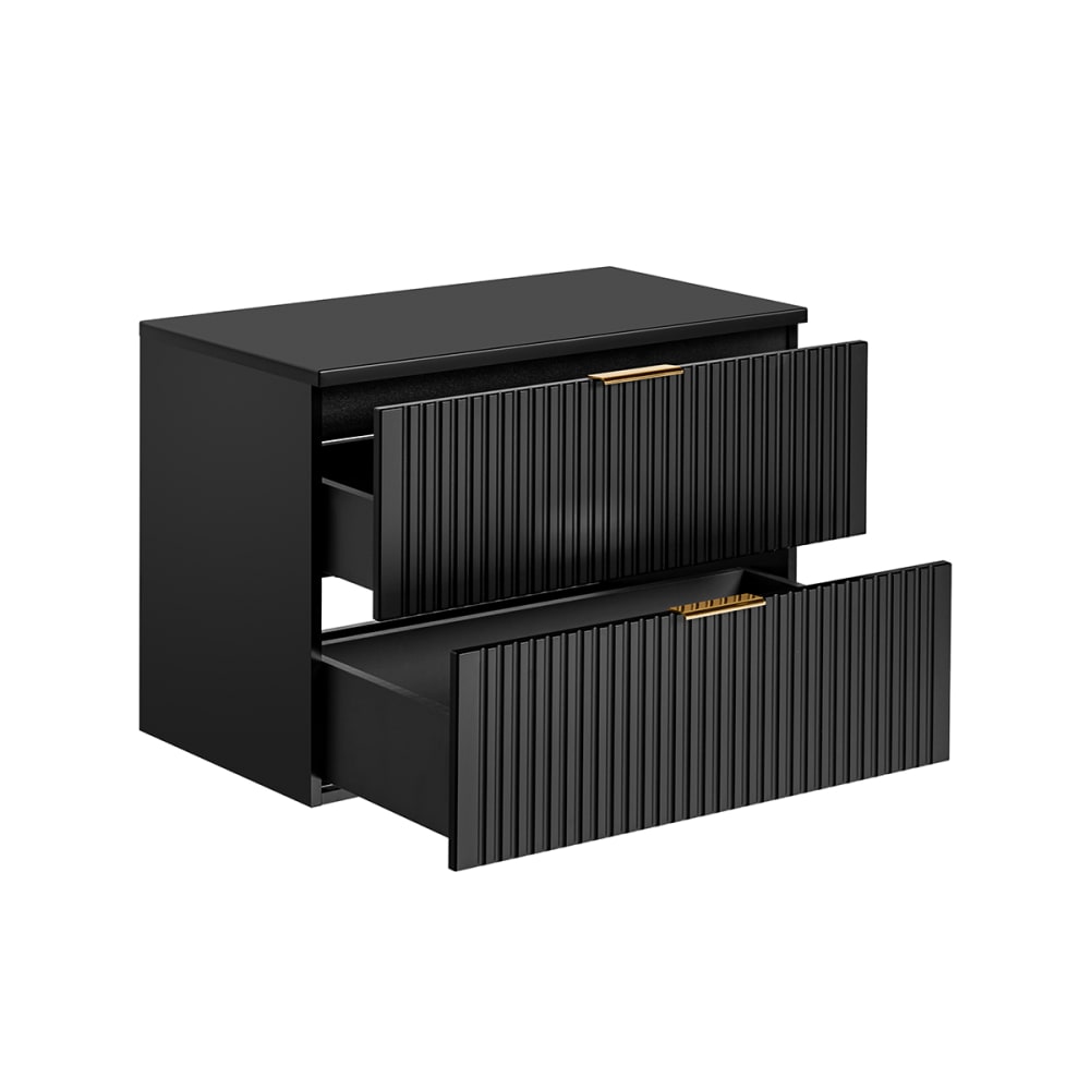 Waschbeckenunterschrank 80cm Waschtisch Adriel SchwarzKollektion :: Adriel Materialien : Melamin- und MDF-Platten 16 mm70% FSC-zertifiziertes Holz aus nachhaltiger ForstwirtschaftPVC-Griffe Farbe : Mattschwarz3 Grifffarben: Mattschwarz, Gold und Silber inbegriffen Eigenschaften: Hängeschrank2 SchubladenGeräuscharmes SchließsystemInklusive WaschtischWandbefestigungen: Schrauben und Dübel inbegriffenEs wird empfohlen, die Befestigungen an den Untergrund anzupassenIn 3 Größen erhältlich: 60 cm, 80 cm und 120 cmIn 3 Farben erhältlich: Mattschwarz, Weiß und Holz in Eichenoptik Gewicht : Waschtischunterschrank: 33 kg Maße: 80,6 x 46 x 59 cm Die angegebenen Maße können um einige Millimeter abweichen. Montagehinweise : Dieses Möbelstück ist für eine Wasserzufuhr aus der Wand konzipiert. Für eine optimale Montage wird die Verwendung eines Platzspar-Siphons dringend empfohlen, je nach Modell ist dieser sogar obligatorisch, um das ordnungsgemäße Schließen der Schubladen zu gewährleisten und Kollisionen mit der Rohrleitung zu vermeiden. Verpackung : Produkt wird geliefert, muss zusammengebaut werden, inkl. Anleitung. Produkt mit 24-monatiger Garantie. Gesamtanzahl der Kartons : 2 Gewicht und Abmessungen der Kartons: 26 kg92 x 48 x 13 cm / 7 kg93 x 51 x 4 cm