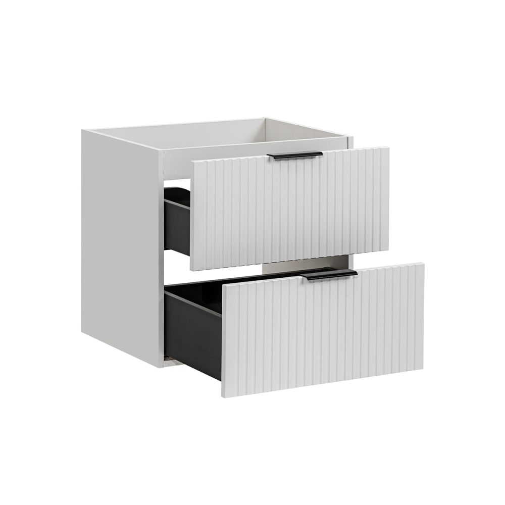 Waschbeckenunterschrank 60cm Adriel WeißKollektion :: Adriel Materialien : Melamin- und MDF-Platten 16 mm70% FSC-zertifiziertes Holz aus nachhaltiger ForstwirtschaftPVC-Griffe Farbe : Weiß3 Grifffarben: Mattschwarz, Gold und Silber inbegriffen Eigenschaften: Hängeschrank2 SchubladenGeräuscharmes SchließsystemWandbefestigungen: Schrauben und Dübel inbegriffenEs wird empfohlen, die Befestigungen an den Untergrund anzupassenErhältlich in 3 Größen: 60 cm, 80 cm und 120 cmErhältlich in 3 Farben: Mattschwarz, Weiß und Holz in Eichenoptik Gewicht : Waschtischunterschrank: 22 kg Maße: 60,2 x 46 x 57 cm Die angegebenen Maße können um einige Millimeter abweichen. Montagehinweise : Dieses Möbelstück ist für eine Wasserzufuhr aus der Wand konzipiert. Für eine optimale Montage wird die Verwendung eines Platzspar-Siphons dringend empfohlen, je nach Modell ist dieser sogar obligatorisch, um das ordnungsgemäße Schließen der Schubladen zu gewährleisten und Kollisionen mit der Rohrleitung zu vermeiden. Verpackung : Produkt wird geliefert, muss zusammengebaut werden, inkl. Anleitung. Produkt mit 24-monatiger Garantie. Gesamtanzahl der Kartons : 1 Gewicht und Abmessungen der Kartons: 22 kg82 x 48 x 13 cm