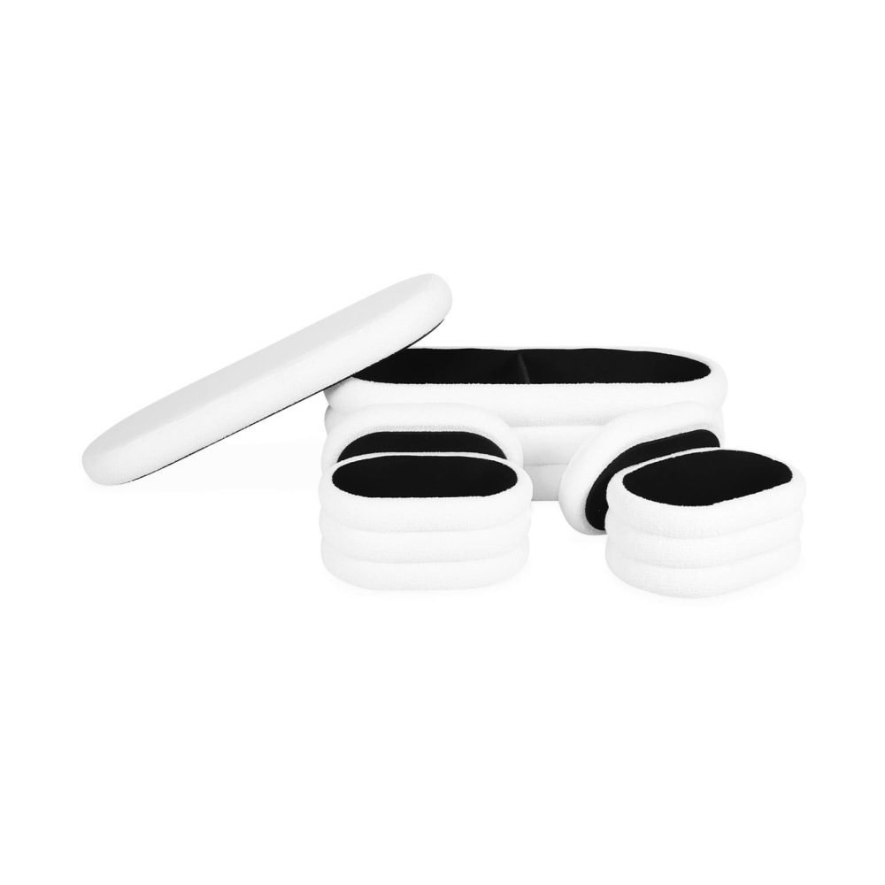 Lassen Sie sich von der zeitgenössischen Anziehungskraft dieser Sitzbank mit Stauraum verzaubern. Ihre ovale Form und die geschwungenen Linien verleihen ihr eine sowohl moderne als auch trendige Ästhetik, die Ihrem Interieur einen Hauch von Eleganz verleiht. Dank des weichen und hellen Materials strahlt sie eine warme Atmosphäre aus, die Sie sicherlich bezaubern wird. Und das ist noch nicht alles: Diese Sitzbank verbirgt zwei zusätzliche Hocker, ebenfalls mit Bouclé bezogen, die unter ihrer Sitzfläche über Stauraum verfügen! Ideal, um zusätzliche Sitzplätze bei geselligen Momenten mit Freunden zu bieten, während Sie Ihre Plaids und Kissen im Wohnzimmer aufbewahren können.