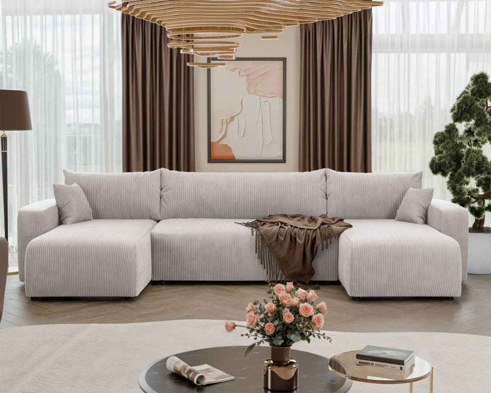 Erleben Sie mit dem U-förmigen Ecksofa Pianoni eine perfekte Kombination aus moderner Eleganz und außergewöhnlichem Komfort. Die weichen, abgerundeten Formen verleihen dem Sofa eine harmonische Optik, während die hochwertige Cord-Optik nicht nur stilvoll aussieht, sondern sich auch angenehm anfühlt. Dank der durchdachten Polsterung mit wellenförmigen Federn und Schaumstoff bietet Pianoni exzellenten Sitz- und Liegekomfort – ideal für gemütliche Stunden mit Familie und Freunden.