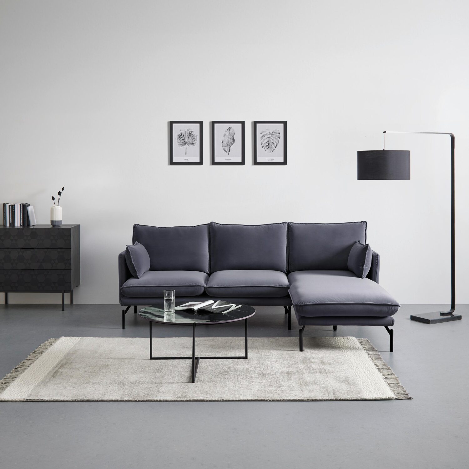 Mit dieser hübschen Wohnlandschaft in Grau holen Sie sich einen ebenso attraktiven wie charmanten Blickfang in Ihr Zuhause. Die ca. 228 x 82 x 84 – 160 cm (B x H x T) große Wohnlandschaft in L-Form mit einem anschmiegsam weichen Samtbezug aus 100 % Polyester bietet Ihnen viel Platz zum Entspannen. Ein Innenleben aus Schaumstoffpolsterung, Wellenunterfederung und Taschenfederkern sorgt für optimalen Sitzkomfort. Schwarze Rundrohrfüße fügen sich harmonisch ins Gesamtbild ein. 3 weich gepolsterte Rückenkissen sowie 2 Zierkissen sind ebenfalls im Lieferumfang enthalten. Die Wohnlandschaft bietet Platz für 3 Personen und ist bis max. 360 kg belastbar. Die Ottomane ist bei diesem Modell auf der rechten Seite. HINWEIS Dieser Artikel wird in unseren Filialen nicht ausgestellt, ist dort jedoch einfach und bequem bestellbar und wird direkt zu Ihnen nach Hause geliefert. Bitte beachten Sie, dass die abgebildete Dekoration im Lieferumfang nicht enthalten ist.
