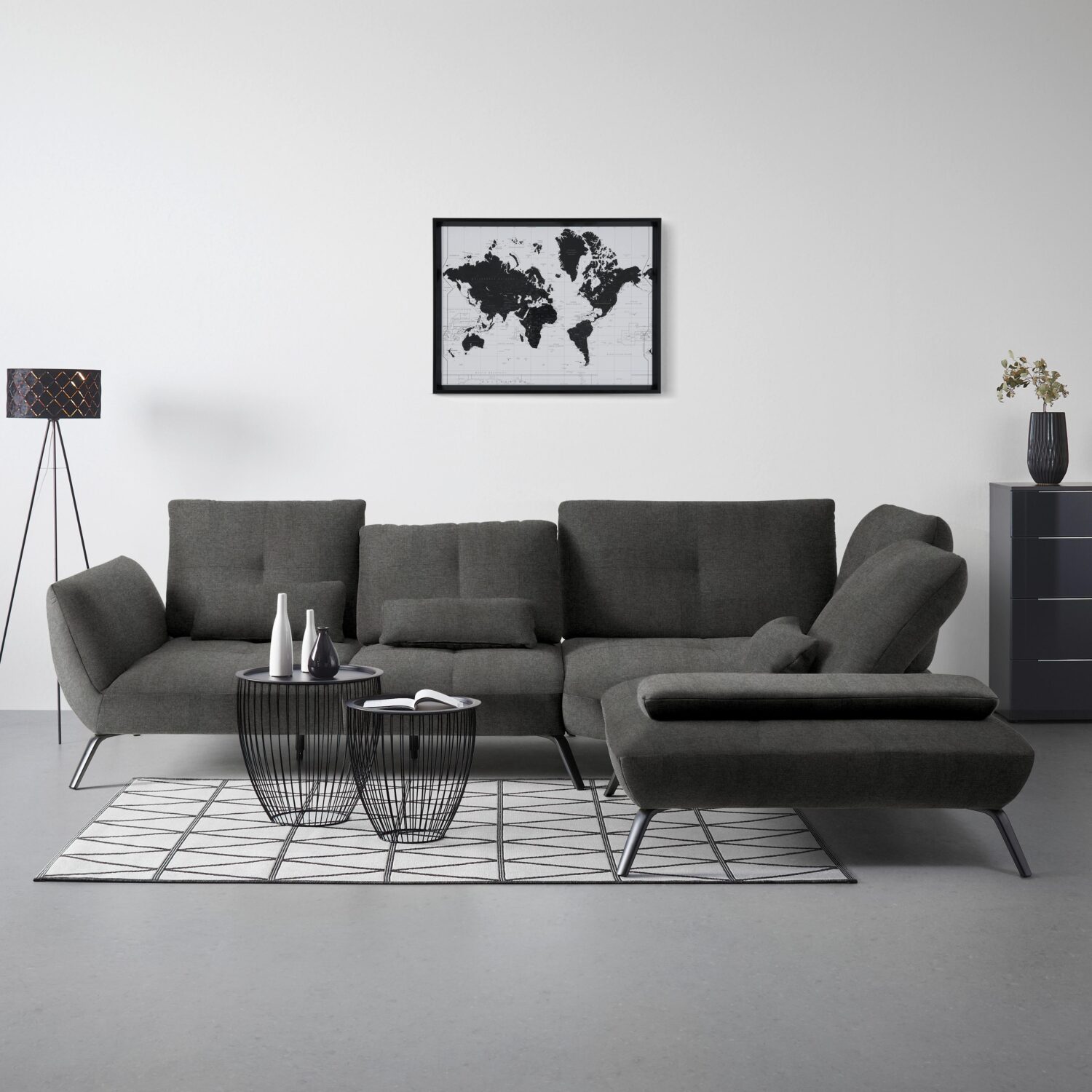 Mit der Wohnlandschaft TRENDY von PREMIUM LIVING holst du dir ein modernes Design in dein Zuhause. Der edle anthrazitfarbene Bezug und die schwarzen Kufenfüße aus Stahl verleihen deinem Wohnraum eine stilvolle Note. Die L-Form der Couch bietet viel Platz zum Entspannen und Verweilen mit Freunden und Familie. Dank der inkludierten Nierenkissen und der Sitztiefenverstellung kannst du es dir so richtig bequem machen. Die Armlehne ist abklappbar und die Rückenlehne ist tiefenverstellbar. Die Wohnlandschaft ist individuell planbar, erweiterbar und bietet eine Typen- und Fußauswahl. Ein Hocker ist ebenfalls erhältlich. Die Oberfläche des Textils ist ein Flachgewebe. Die Wohnlandschaft mit Maßen von ca. 310 x 93 x 250 cm (B x H x T). Die Sitzhöhe liegt bei ca. 43 cm und die Sitztiefe ist zwischen ca. 61-88 cm verstellbar. Die maximale Belastbarkeit pro Sitz beträgt ca. 120 kg, wobei die Couch insgesamt 4 Sitzplätze bietet.