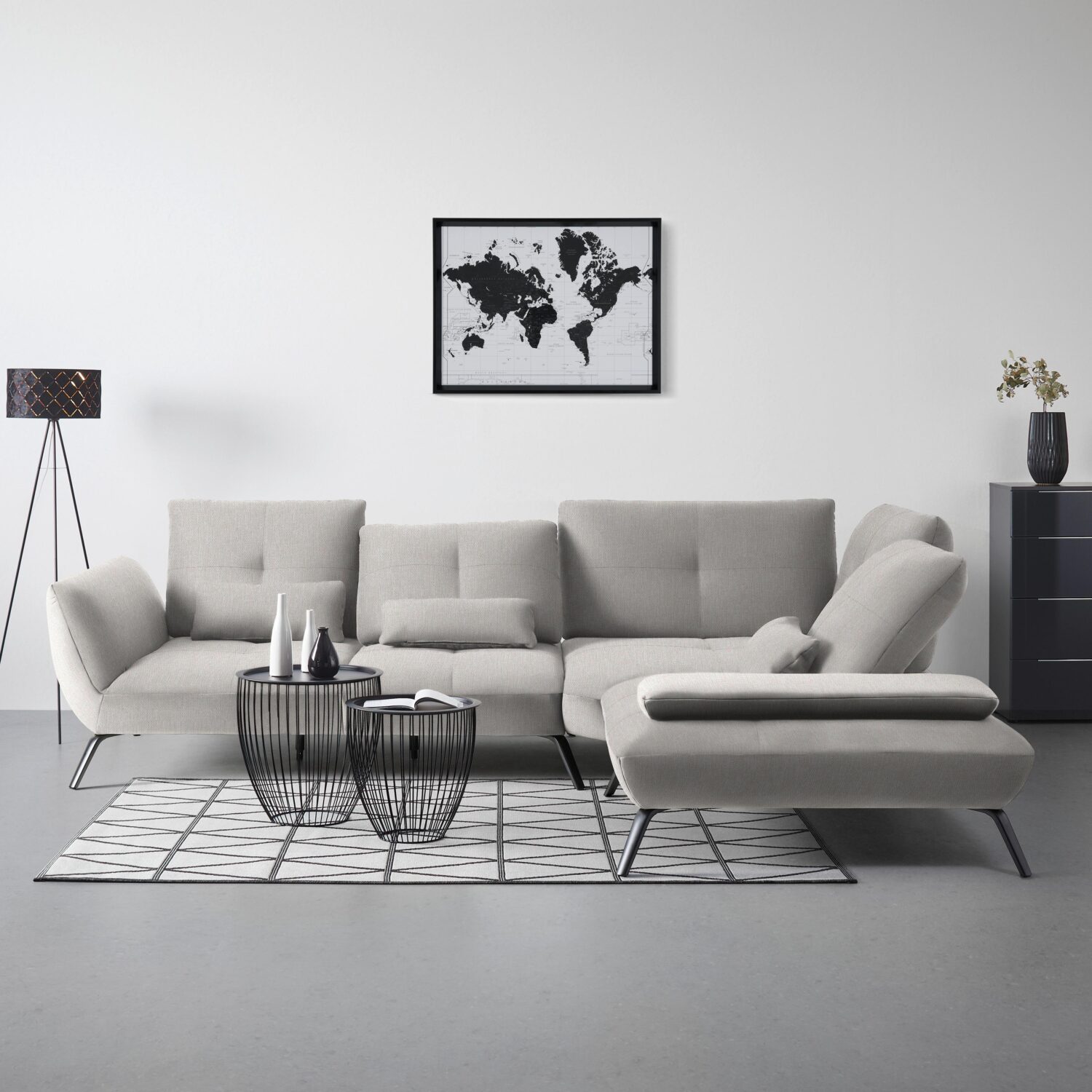 Das warme, elegante Beige verleiht dieser Wohnlandschaft Trendy von PREMIUM LIVING ein helles, freundliches Ambiente und zeitlose Modernität. Klare Linien und dezente schwarze Metallfüße unterstreichen das hochwertige Design und machen sie zum stilvollen Mittelpunkt in deinem Wohnzimmer. Für entspannten Komfort sorgt die Kombination aus abklappbaren Kopfstützen, flexibler Armlehne, verstellbarer Sitztiefe und perfekt abgestimmten Nierenkissen. Ob beim Lesen, Filme schauen oder geselligen Abenden mit Freunden – dein Sofa passt sich deinen Bedürfnissen optimal an. Auch offen im Raum platziert, überzeugt die Wohnlandschaft von allen Seiten und eignet sich perfekt für moderne Wohnkonzepte. Der weiche Flachgewebebezug und die hochwertige Schaum- und Vollschaumpolsterung garantieren ein rundum angenehmes Sitzgefühl. Optional rundet ein passender Hocker das Ensemble ab. Maße: ca. 310 x 93 x 250 cm (B x H x T), Sitzhöhe ca. 43 cm Sitzplätze: 4 Modern. Stilvoll. Komfortabel. PREMIUM LIVING
